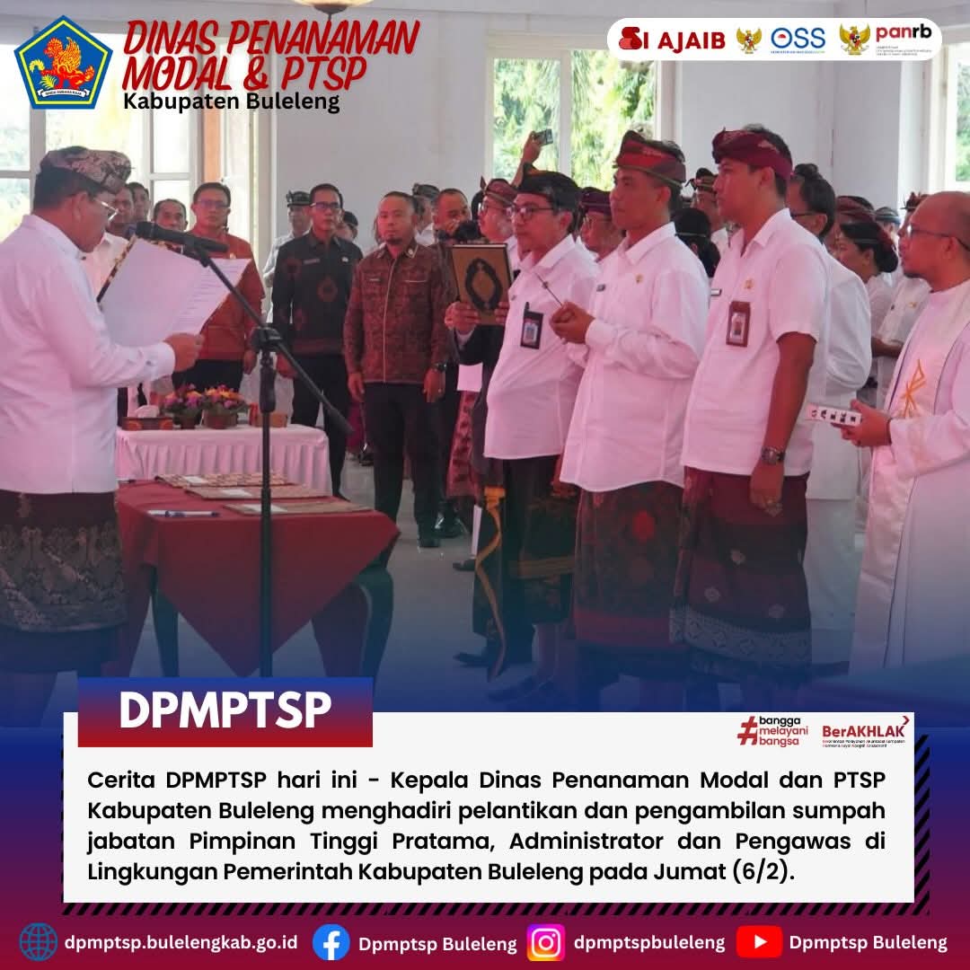 Kepala Dinas Penanaman Modal dan PTSP Kabupaten Buleleng menghadiri pelantikan dan pengambilan sumpah jabatan Pimpinan Tinggi Pratama, Administrator dan Pengawas di Lingkungan Pemerintah Kabupaten Buleleng pada Jumat (6/2).