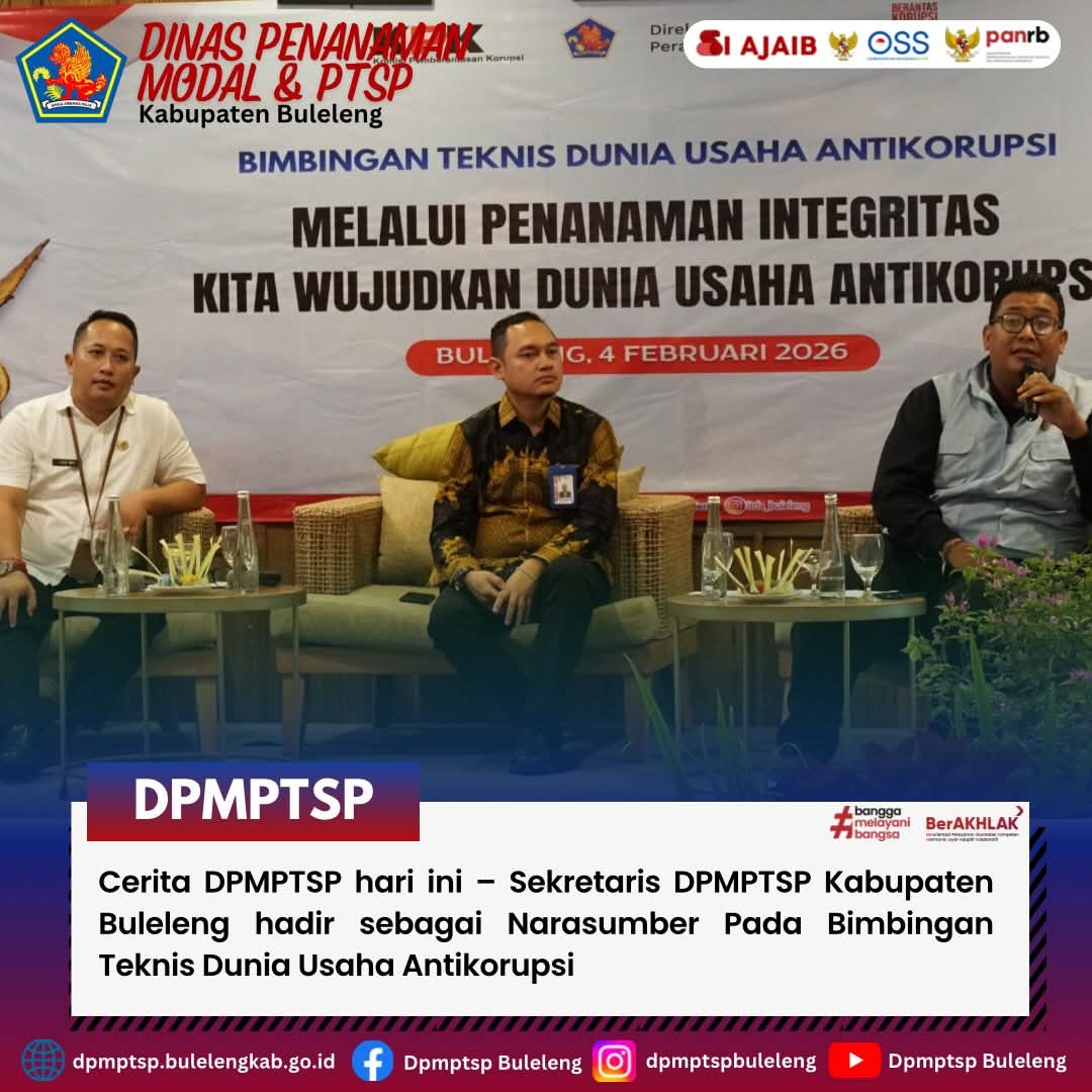 Bertempat di New Sunari Lovina Beach Resort terselenggara Bimtek Dunia Usaha Antikorupsi oleh Inspektorat Daerah Kabupaten Buleleng pada Rabu (4/2). Pada kegiatan bimtek hari ini Sekretaris DPMPTSP, Ketut Agus Widi Sanjaya, S.IP., M.M turut hadir memenuhi undangan sebagai narasumber.