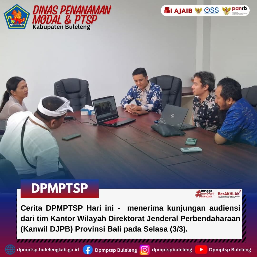 Dinas Penanaman Modal dan Pelayanan Terpadu Satu Pintu (DPMPTSP) Kabupaten Buleleng menerima kunjungan audiensi dari tim Kantor Wilayah Direktorat Jenderal Perbendaharaan (Kanwil DJPB) Provinsi Bali pada Selasa (3/3). Pertemuan yang berlangsung di ruang prioritas DPMPTSP Buleleng ini fokus membahas pemetaan peluang investasi daerah guna mendukung analisis ekonomi regional.