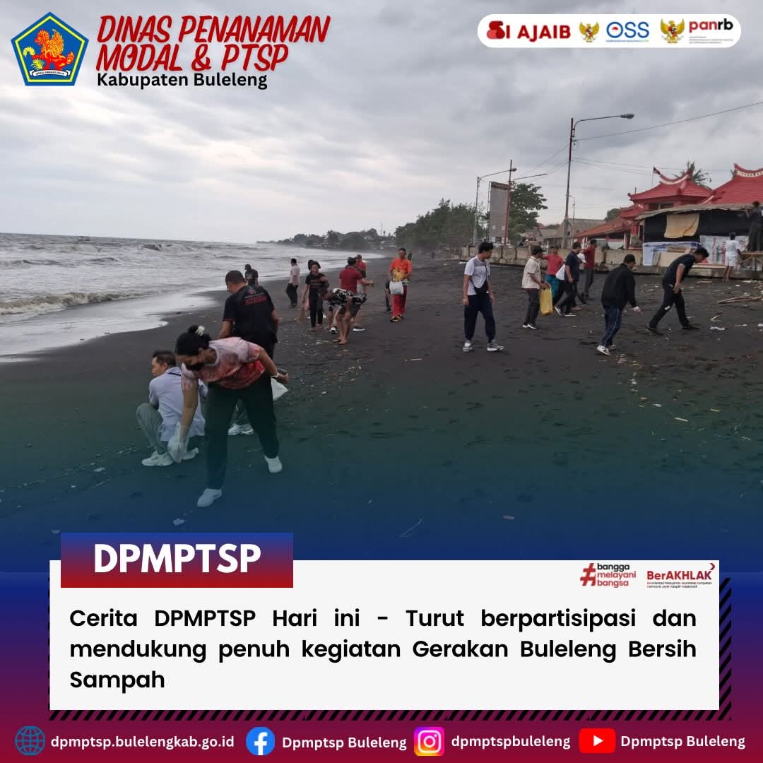 DPMPTSP Kabupaten Buleleng turut berpartisipasi dan mendukung penuh kegiatan Gerakan Buleleng Bersih Sampah yang dilaksanakan hari ini, 23 Januari 2026. Berlokasi di Pantai Kampung Baru, Kelurahan Kampung Baru, aksi ini merupakan wujud nyata kepedulian kami terhadap kelestarian lingkungan pesisir di Bumi Panji Sakti.