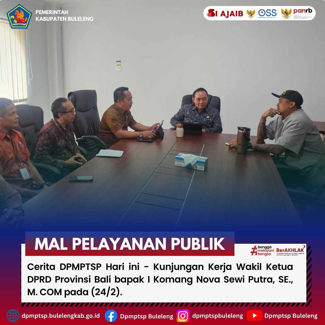 Dalam rangka pelaksanaan fungsi pengawasan DPRD bidang Pemerintahan dan Hukum Pimpinan DPRD Provinsi Bali melaksanakan kunjungan koordinasi terkait implementasi Penegakan Peraturan Daerah Provinsi Bali Nomor 2 Tahun 2023 tentang Rencana Tata Ruang Wilayah (RTRW) Provinsi Bali Tahun 2023-2043 dan Penerbitan Perizinan Bangunan dalam mencegah alih fungsi lahan produktif serta kepemilikan lahan secara Nominee oleh Warga Negara Asing ke Dinas Penanaman Modal dan Pelayanan Terpadu Satu Pintu Kabupaten Buleleng.